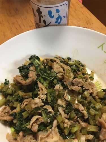 素晴らしい朝ご飯を作った。 日曜日にマルエツで買った葉つき大根88円を今日朝ご飯に豚バラと胡麻油と甜麺醤で炒めた。 娘と2人の朝ご飯ご飯もちろん今日の昼間のお弁当のおかずになった。 美味しかった! 土曜日、大磯で買ったいかゲソ塩辛がもうビンが空に…